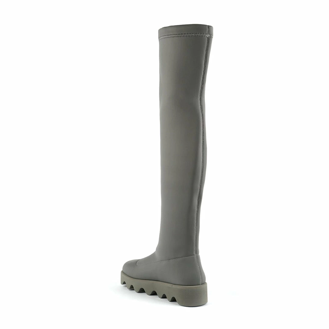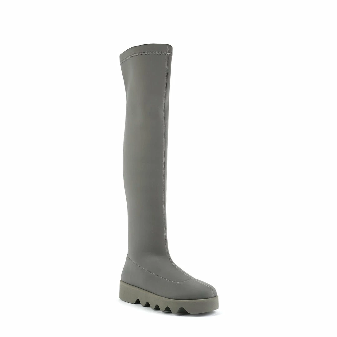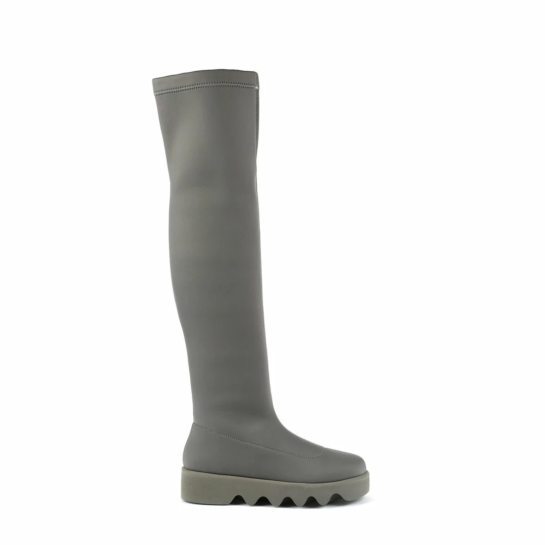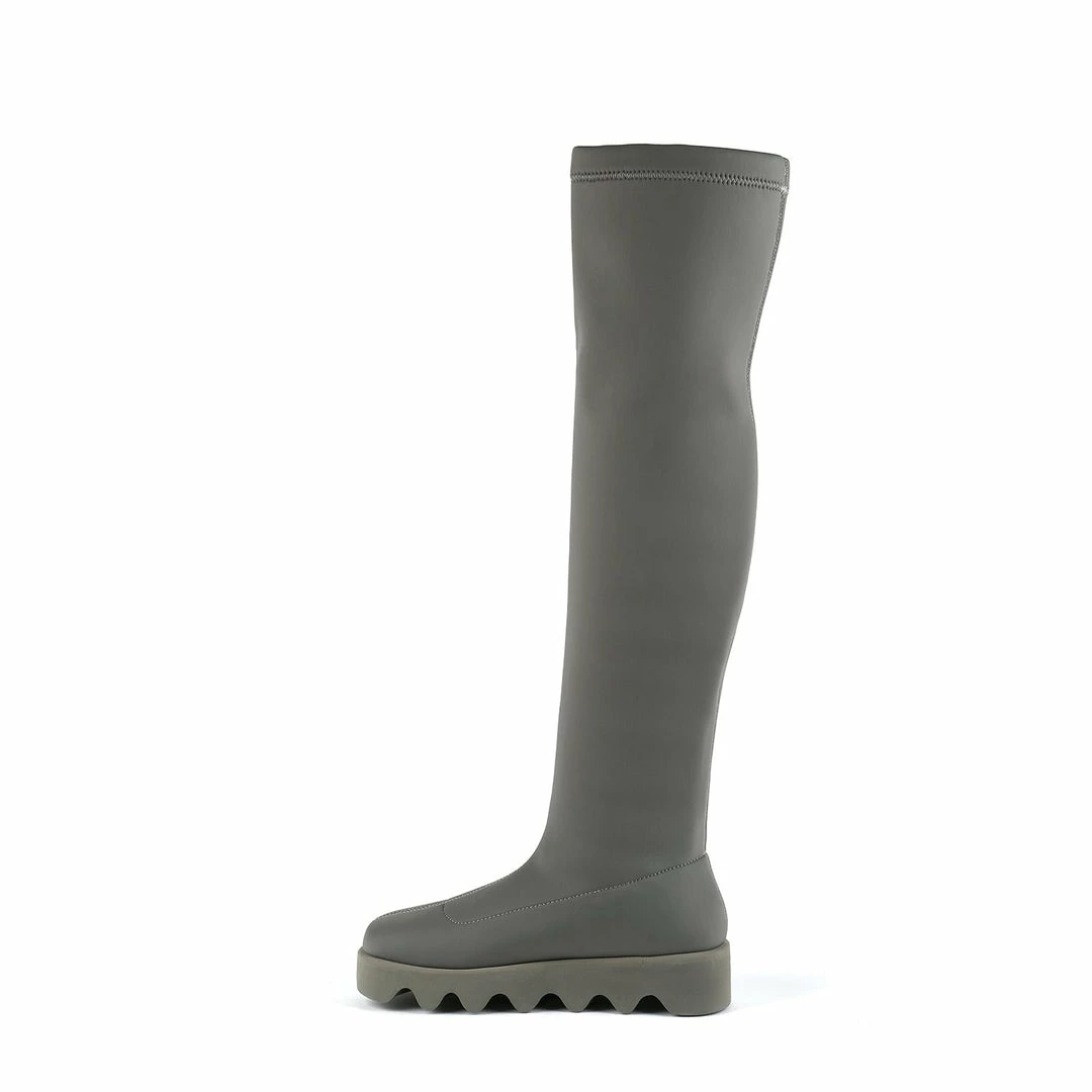The Bounce Long Boot is a pull on boot fabricated with neoprene and grounded by a chunky, undulating sole.