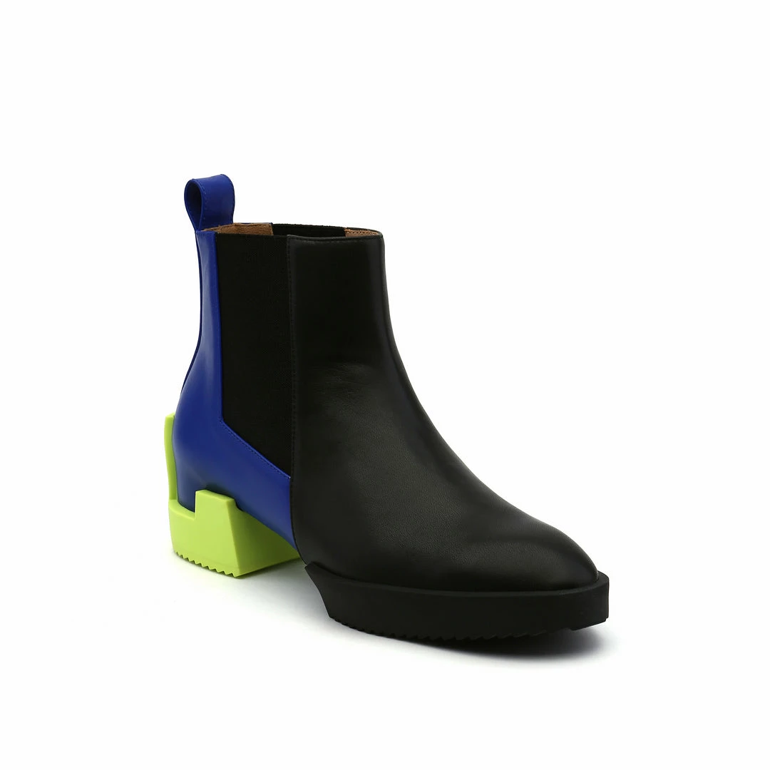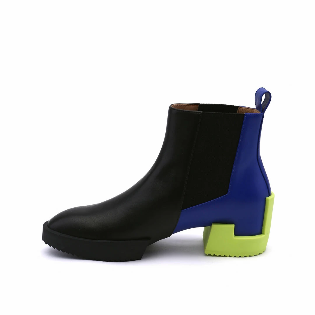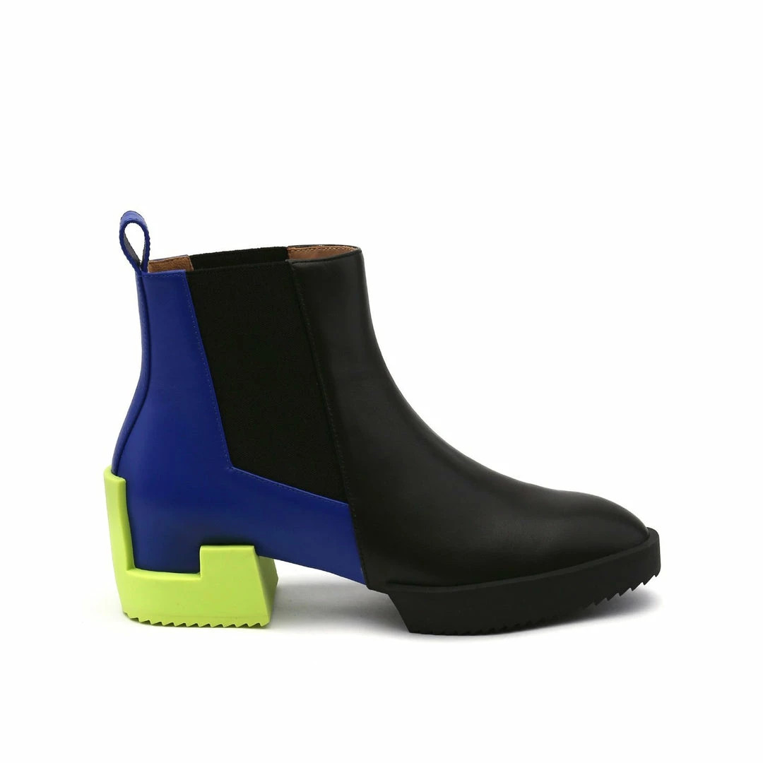 The Cubic Bootie is a Chelsea boot featuring geometric rubber caps that exaggerate the heel.