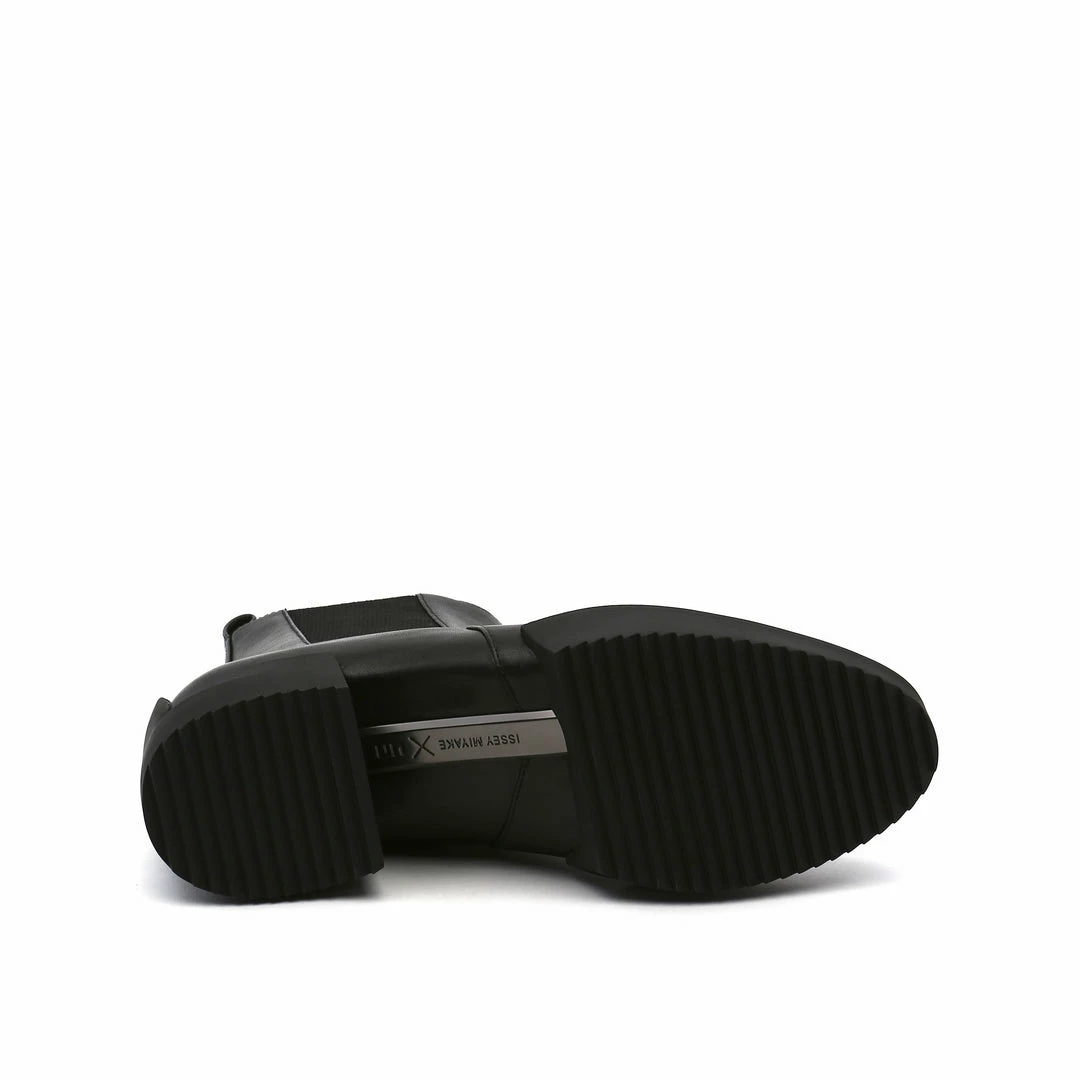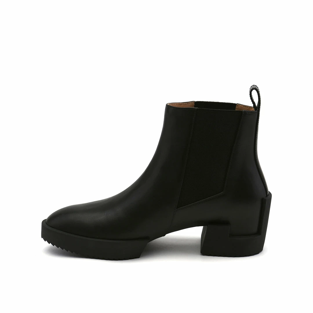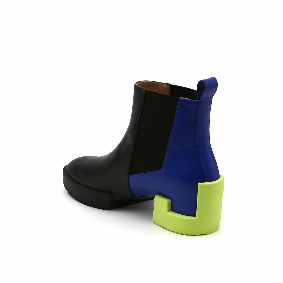 The Cubic Bootie is a Chelsea boot featuring geometric rubber caps that exaggerate the heel.