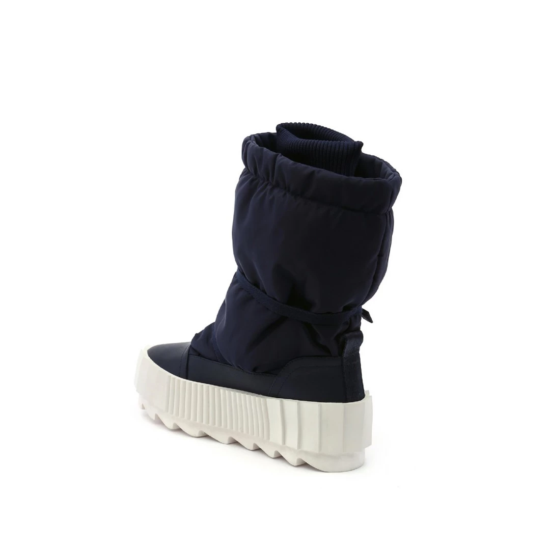 The Arctic Boot is a mid-calf cold weather boot. The puffy nylon upper, which is cinched by slim utility straps and finished with a cozy ribbed cuff, sits atop a statement cleated platform.