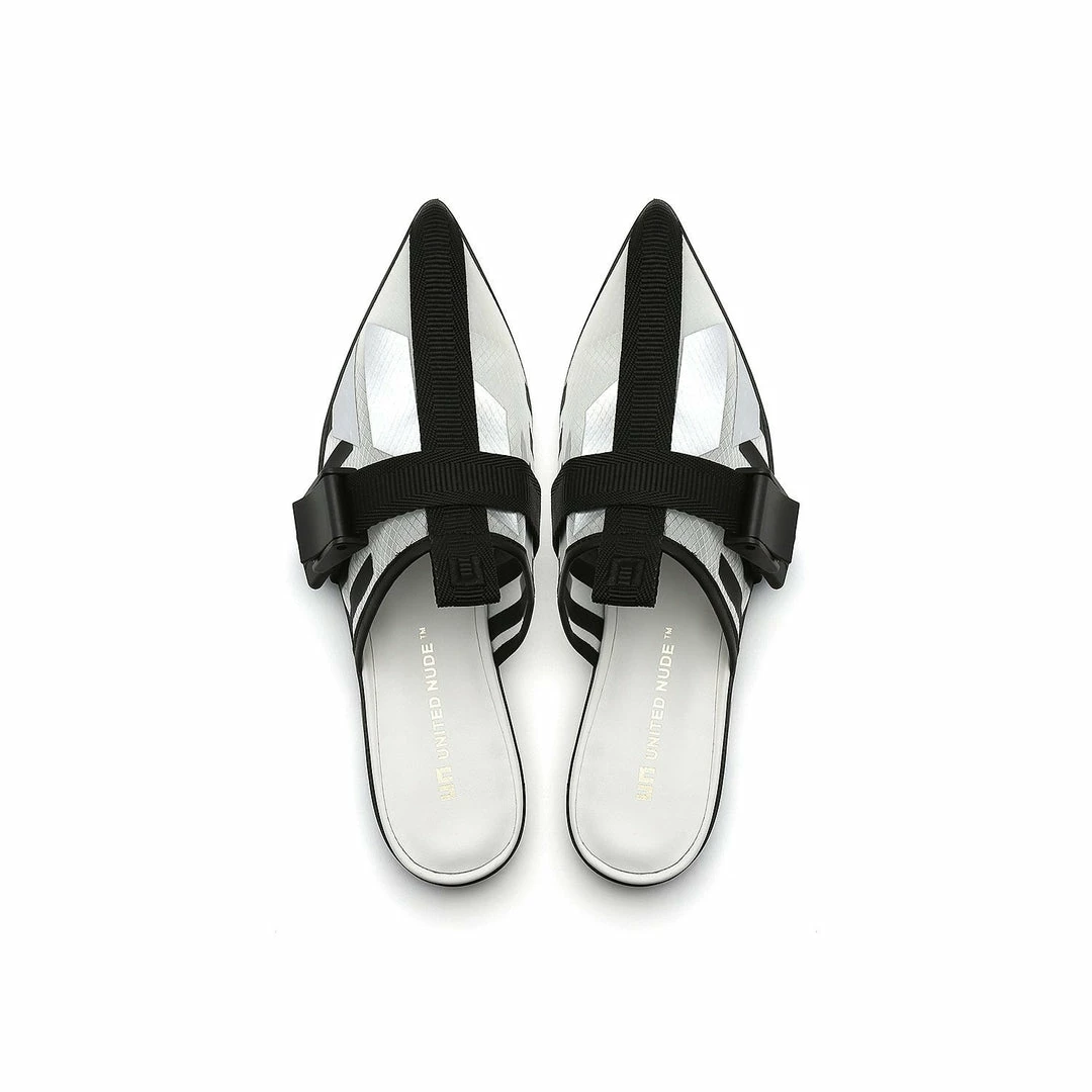 Contrasting with the heat pressed linear graphics, the adjustable strap adds a bold detail to the opaque nylon mesh upper on the fashion forward pointy-toe Calli Mule Lo.
