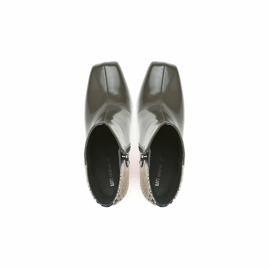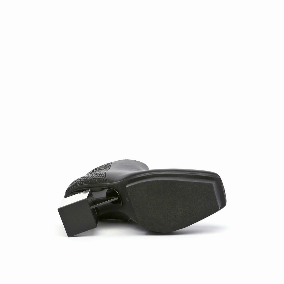 The Cube Boxy Hi is a high heel, square toe ankle boot grounded by a geometric block heel. A thin metallic structure extends from the shank to bisect the heel, giving a gravity defying illusion.