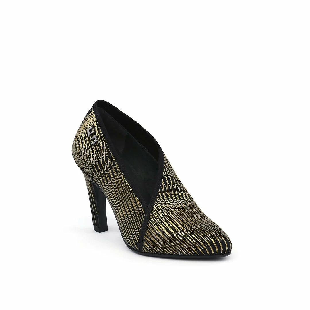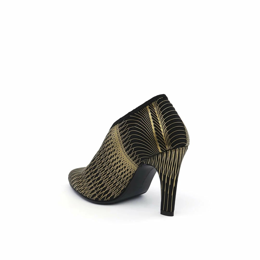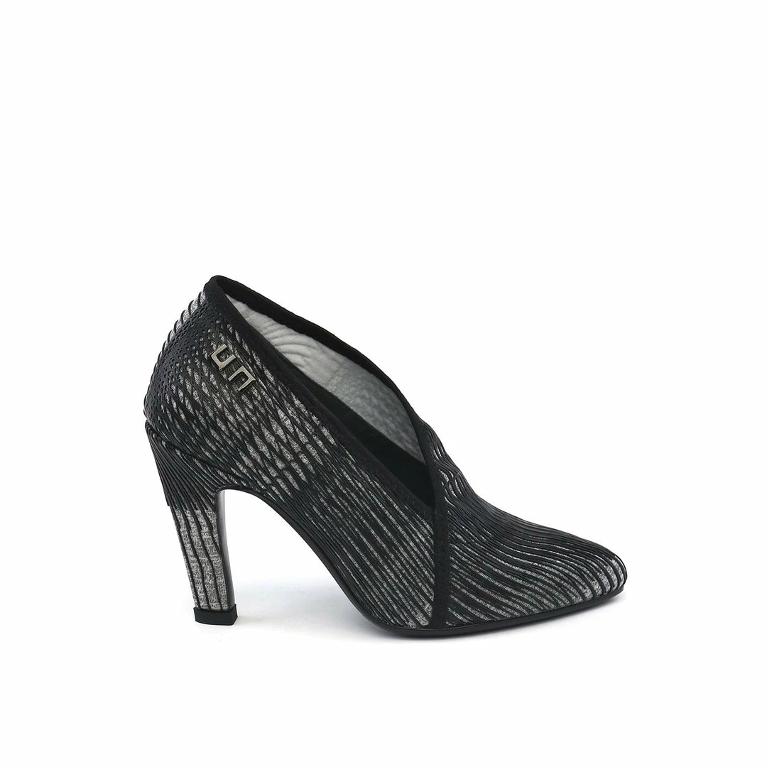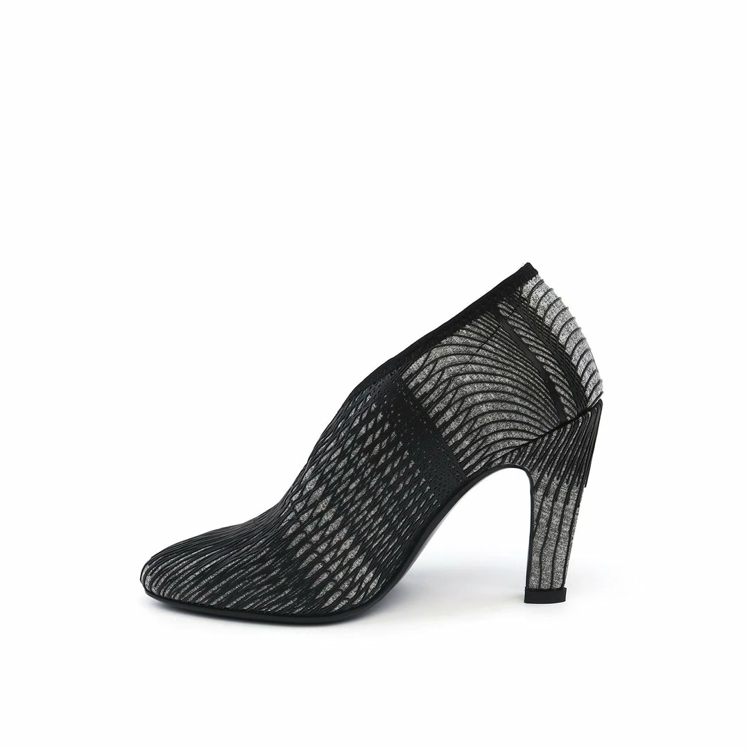 The Fold Lite Hi is a high heel ankle bootie with a soft almond toe and an asymmetrical top line.