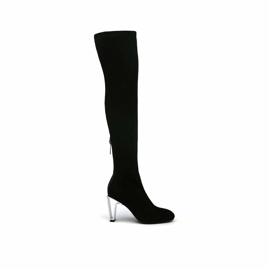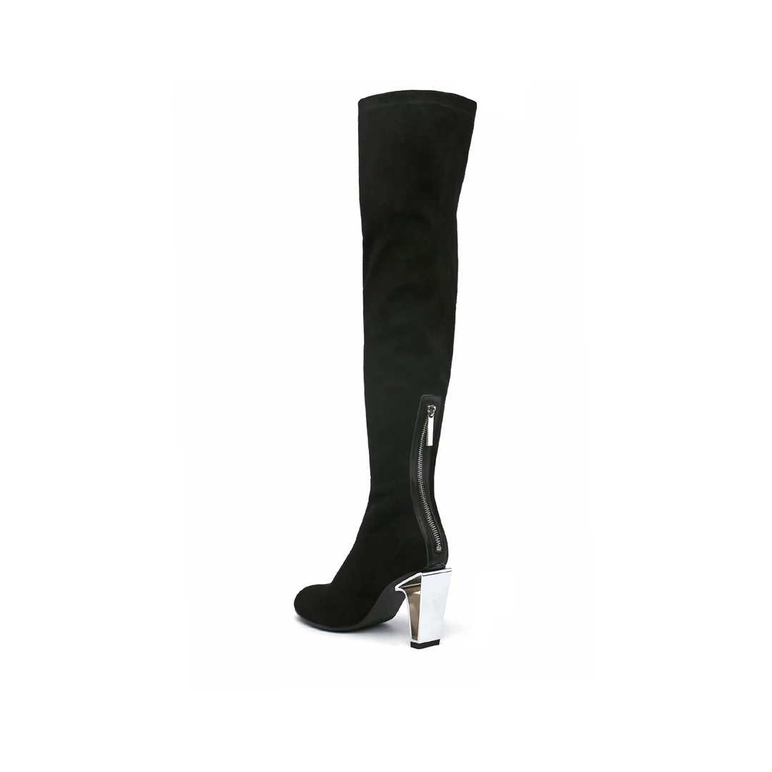 The Icon Tall Boot is an over-the-knee, slim-fitting boot featuring a soft microfiber upper and an aluminum cut-out statement heel.