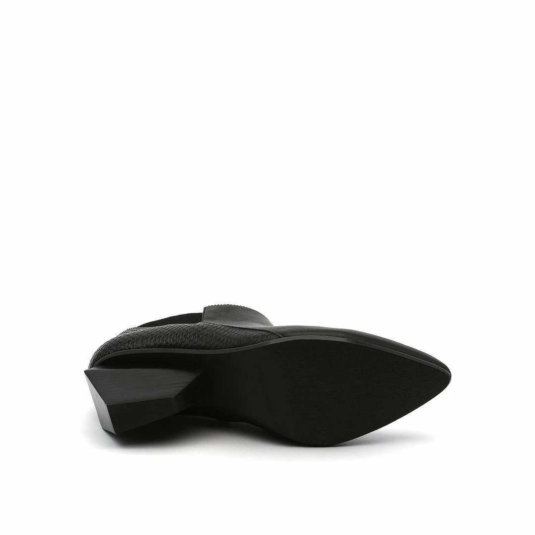 The Jacky Mid is a Chelsea boot with a modern twist featuring the carry-over mid heel. Sharp diagonal lines and a pointy toe accentuate the angular leather-stacked heel while the textured rubber outsole offers extra grip.