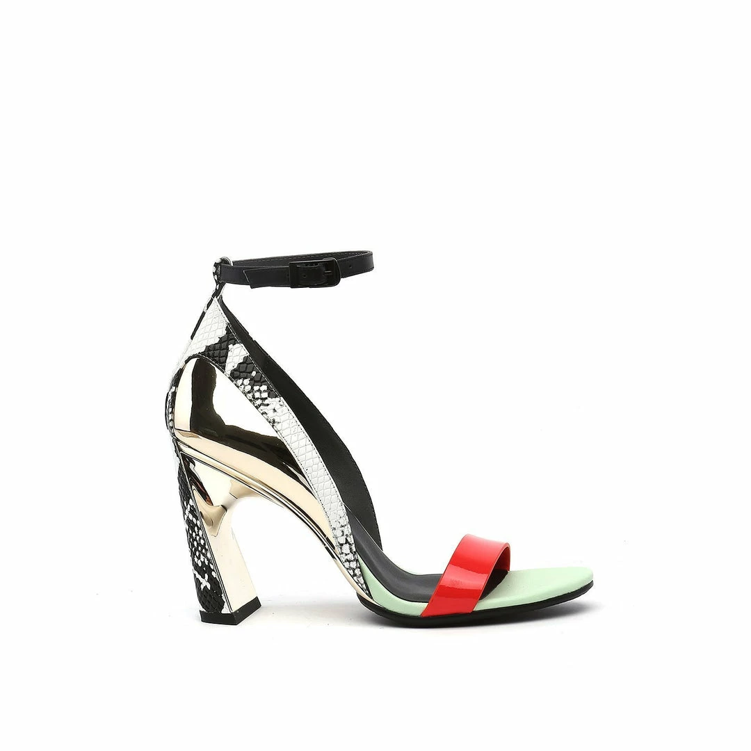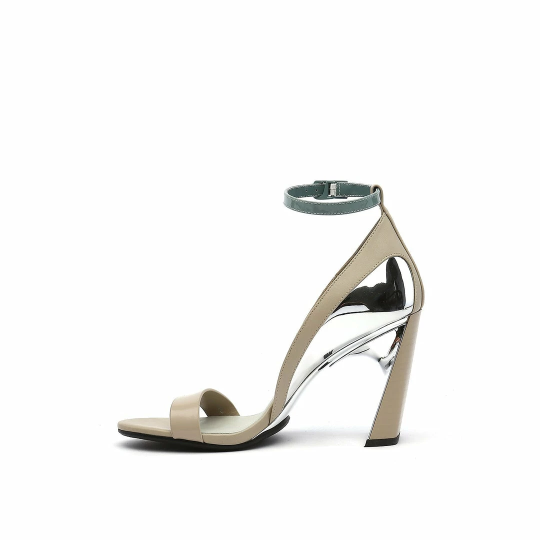 The Molten Flow Sandal Hi is an elegant two strap high heel set on a slim, yet robust heel. The metallic silhouette gives the impression of liquid metal being gracefully poured over the shoe.