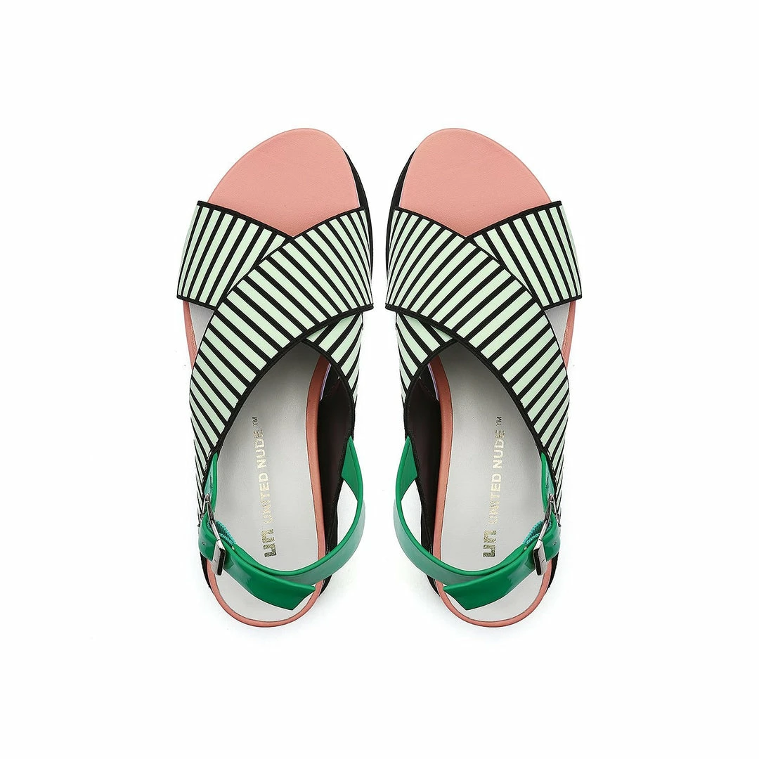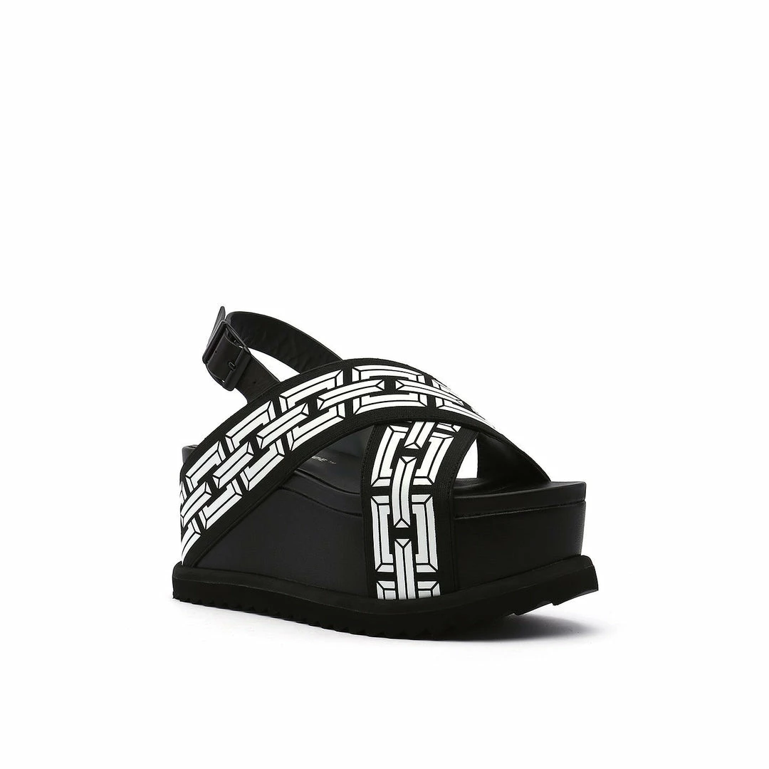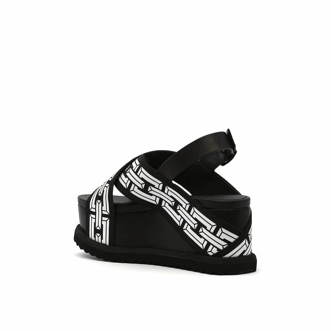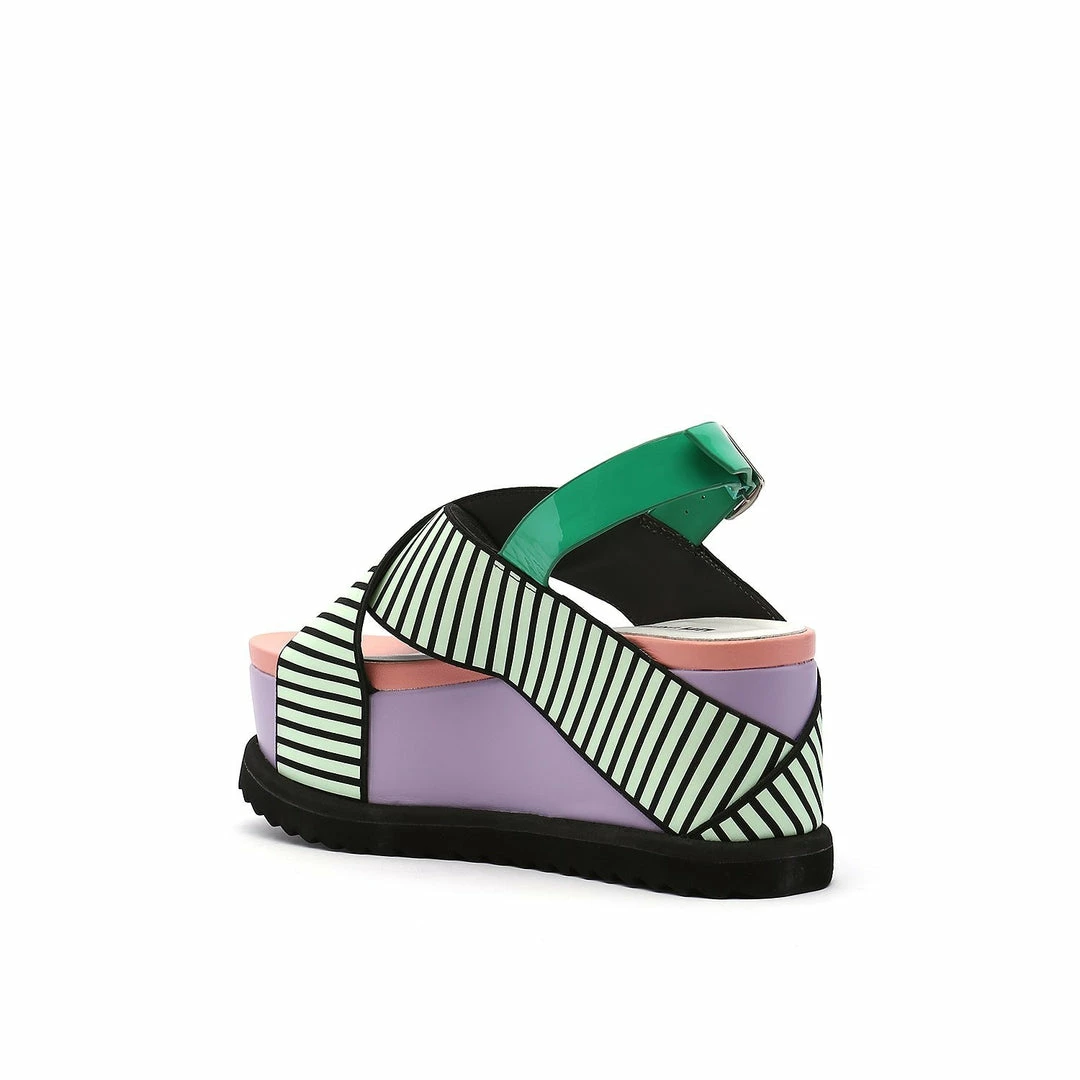 The Pop Cross Wedge is a flatform sandal with graphic criss cross straps anchored by a toothy serrated rubber sole.