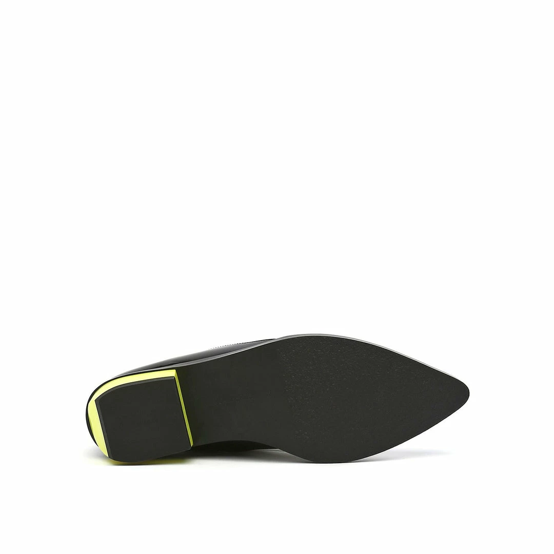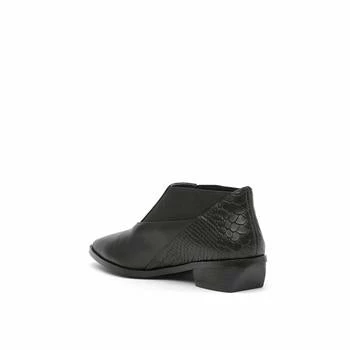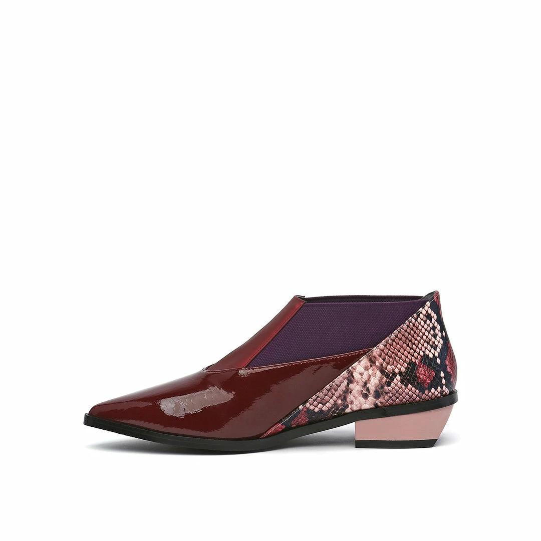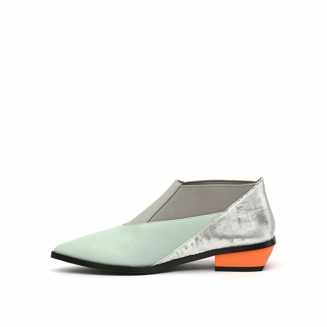The Spark Bootie Lo is a pointed toe flat bootie. A patchwork of leathers and elastics create a bold statement.