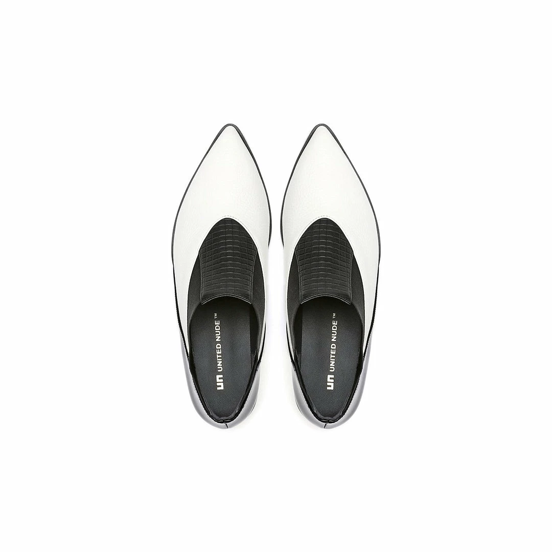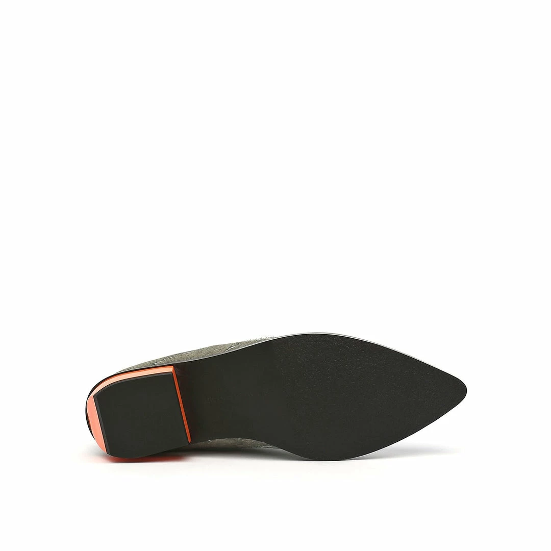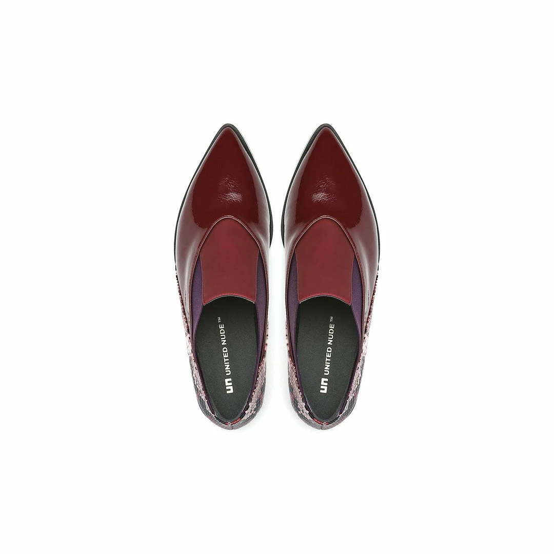The Spark Bootie Lo is a pointed toe flat bootie. A patchwork of leathers and elastics create a bold statement.