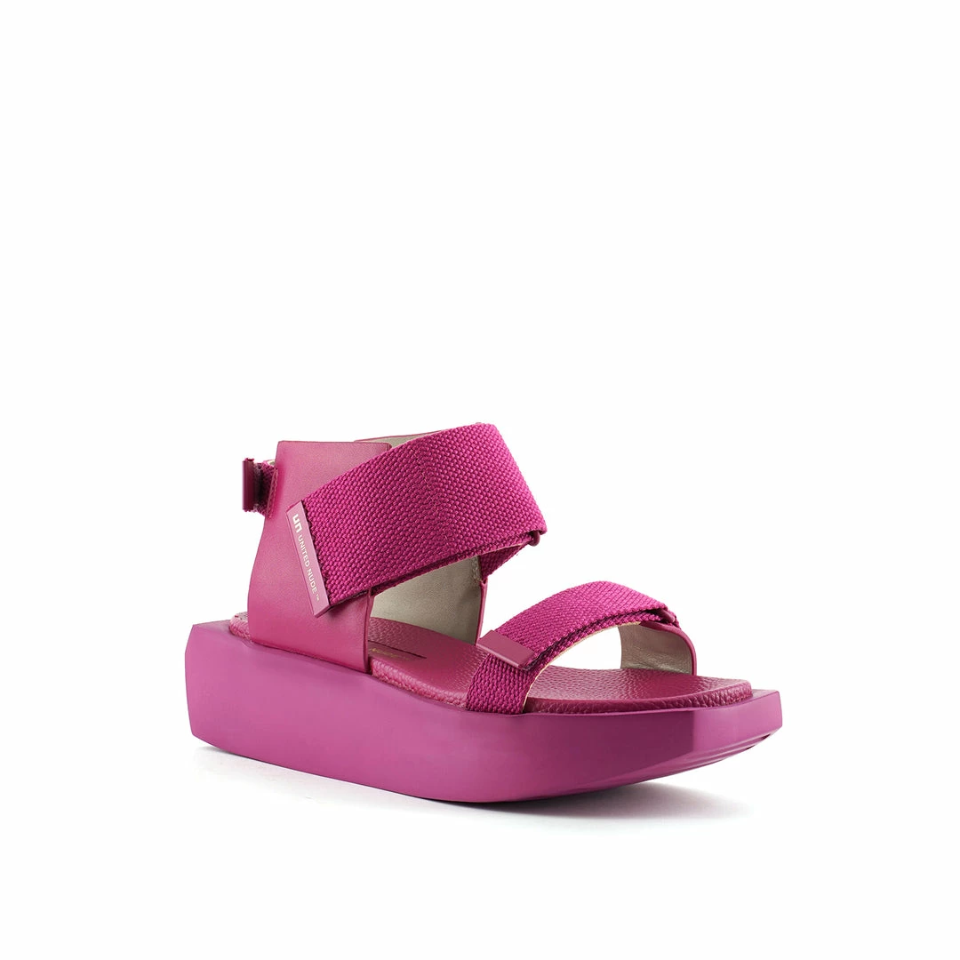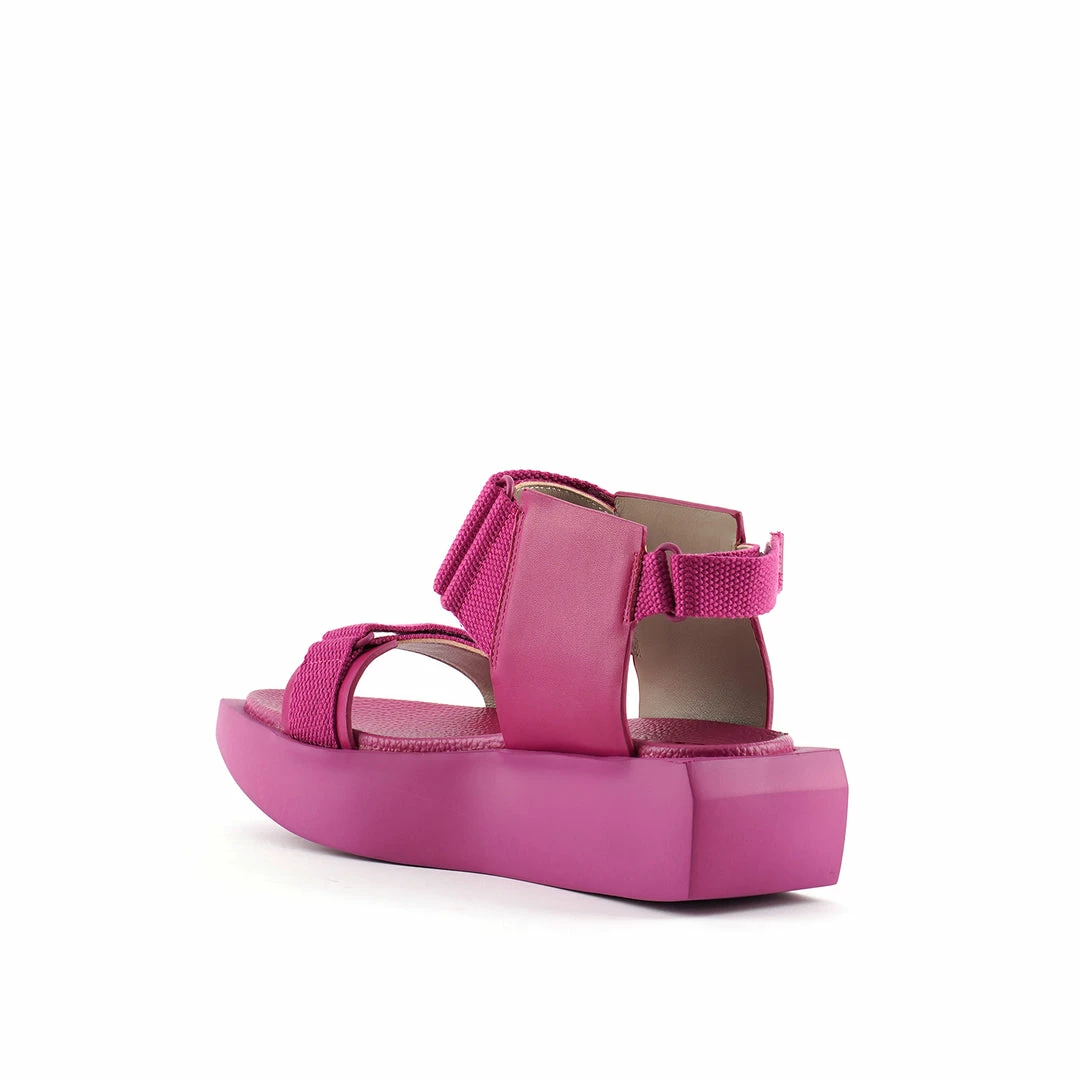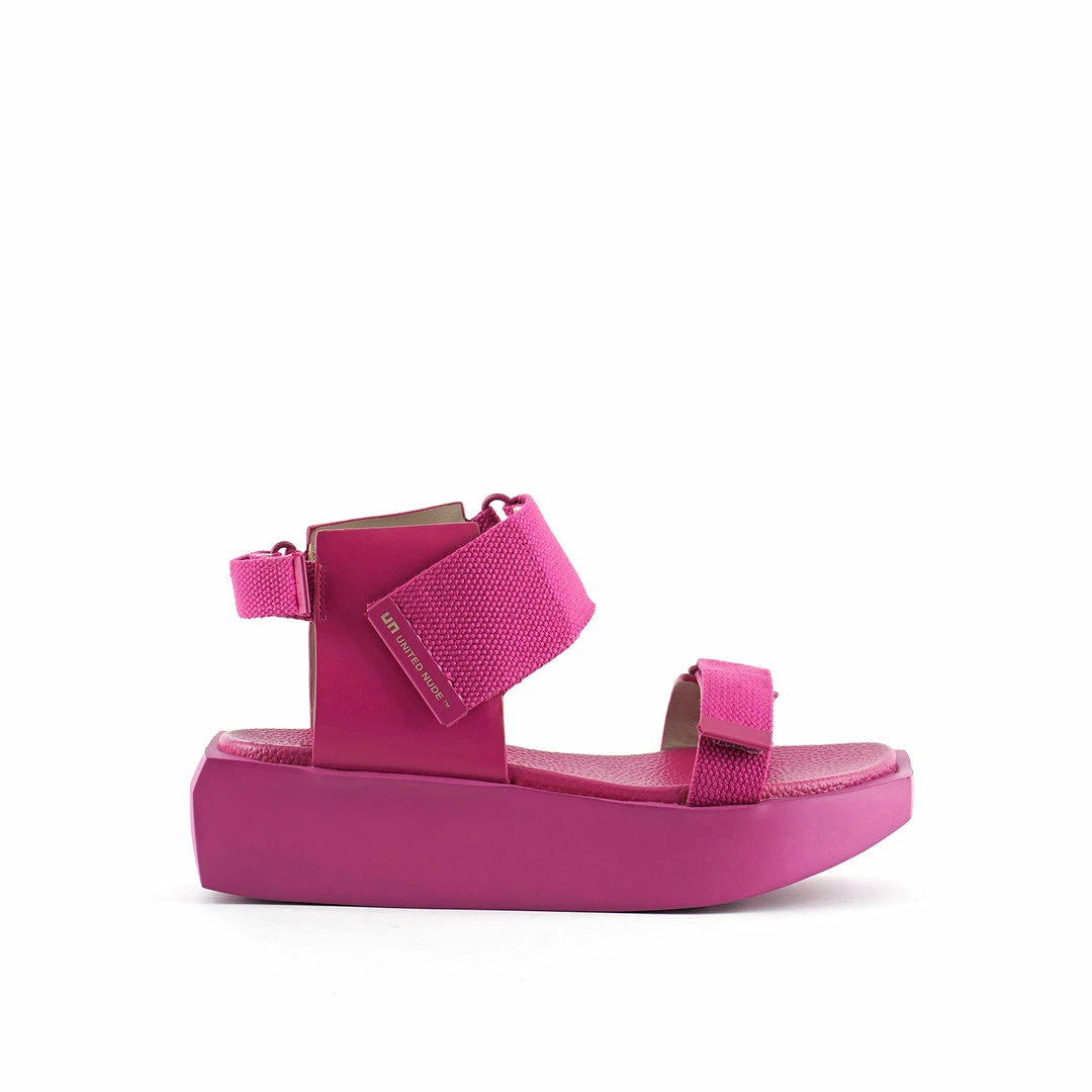 The Wa Lo is a flatform sandal featuring three adjustable cotton straps, metal tips, velcro closures, and a sculptural EPR outsole.