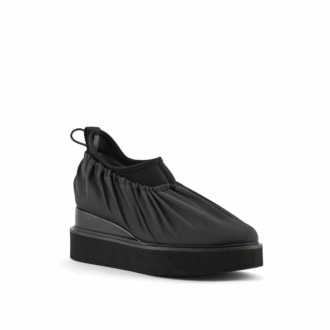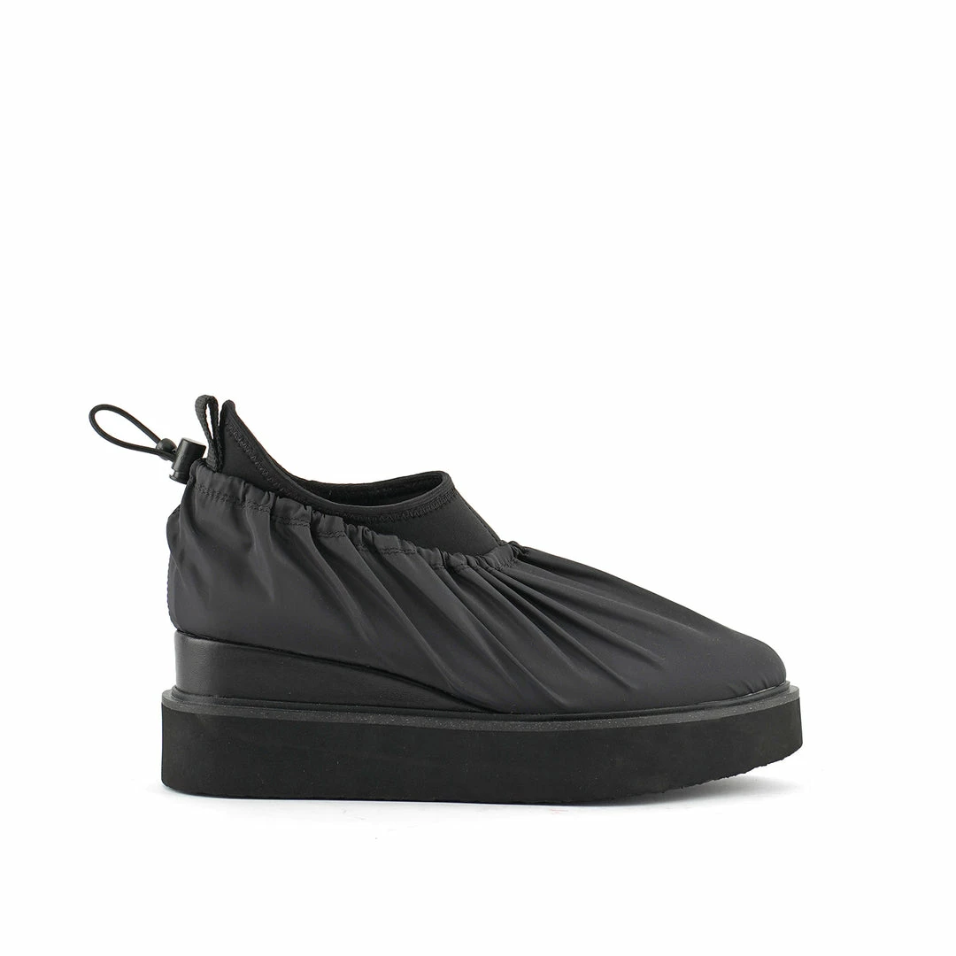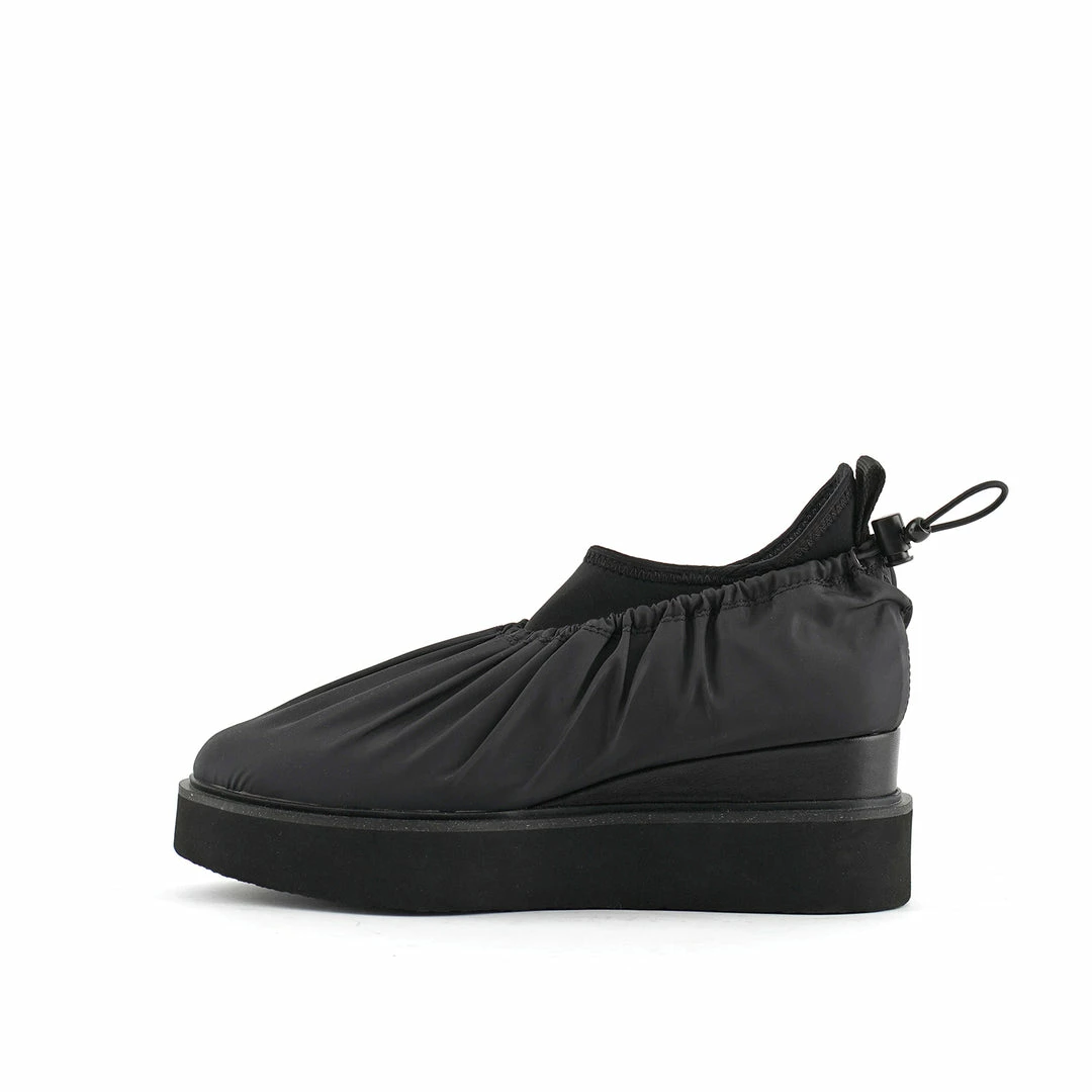 The Cover Casual is a comfortable flatform slip on with a sock-like neoprene upper and a nylon fabric overlay. An exposed wedge adds a gentle lift. This style is inspired by the outdoors – finished with a light collapsible fabric, a ruched topline, and an adjustable drawstring toggle.
