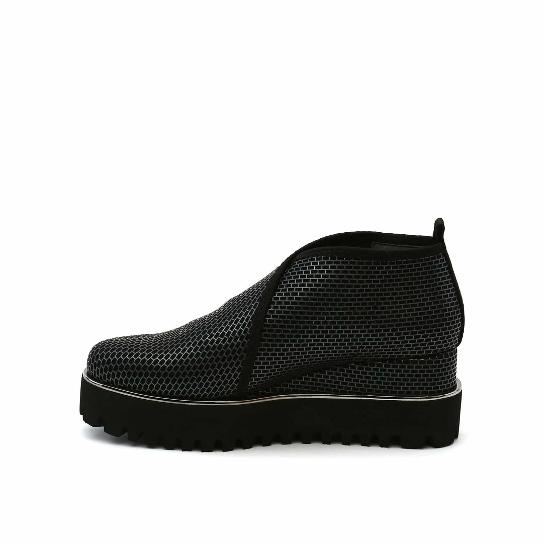 The Fold Casual II is a flatform slip on with an asymmetrical topline and cleated platform outsole. An exposed wedge adds a gentle lift to these metallic trimmed shoes.