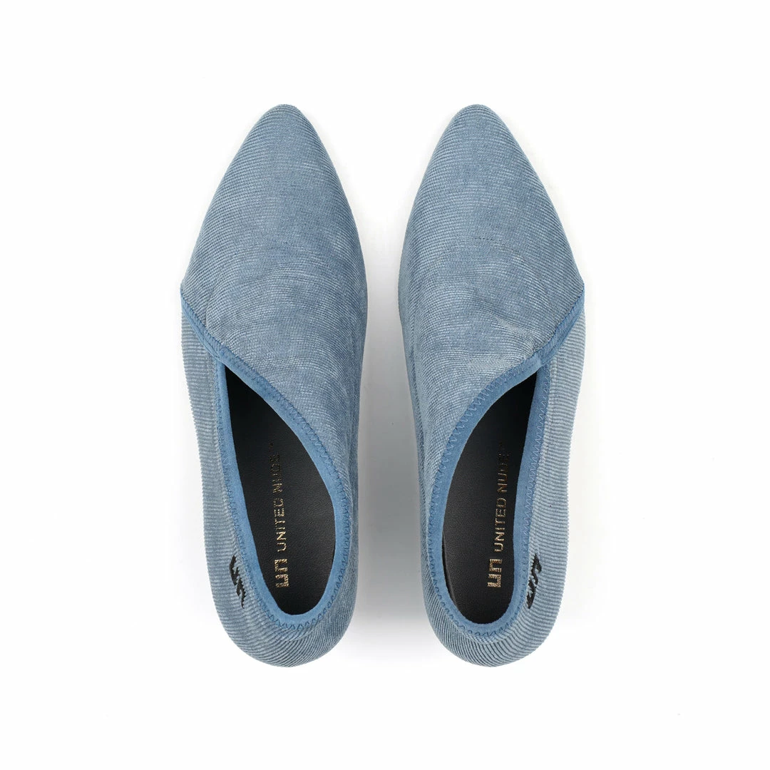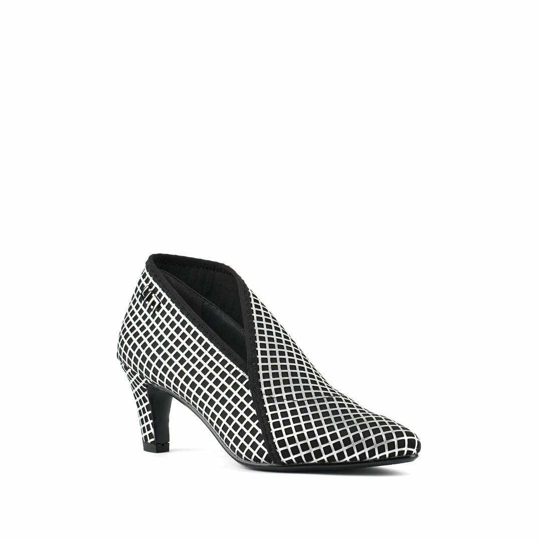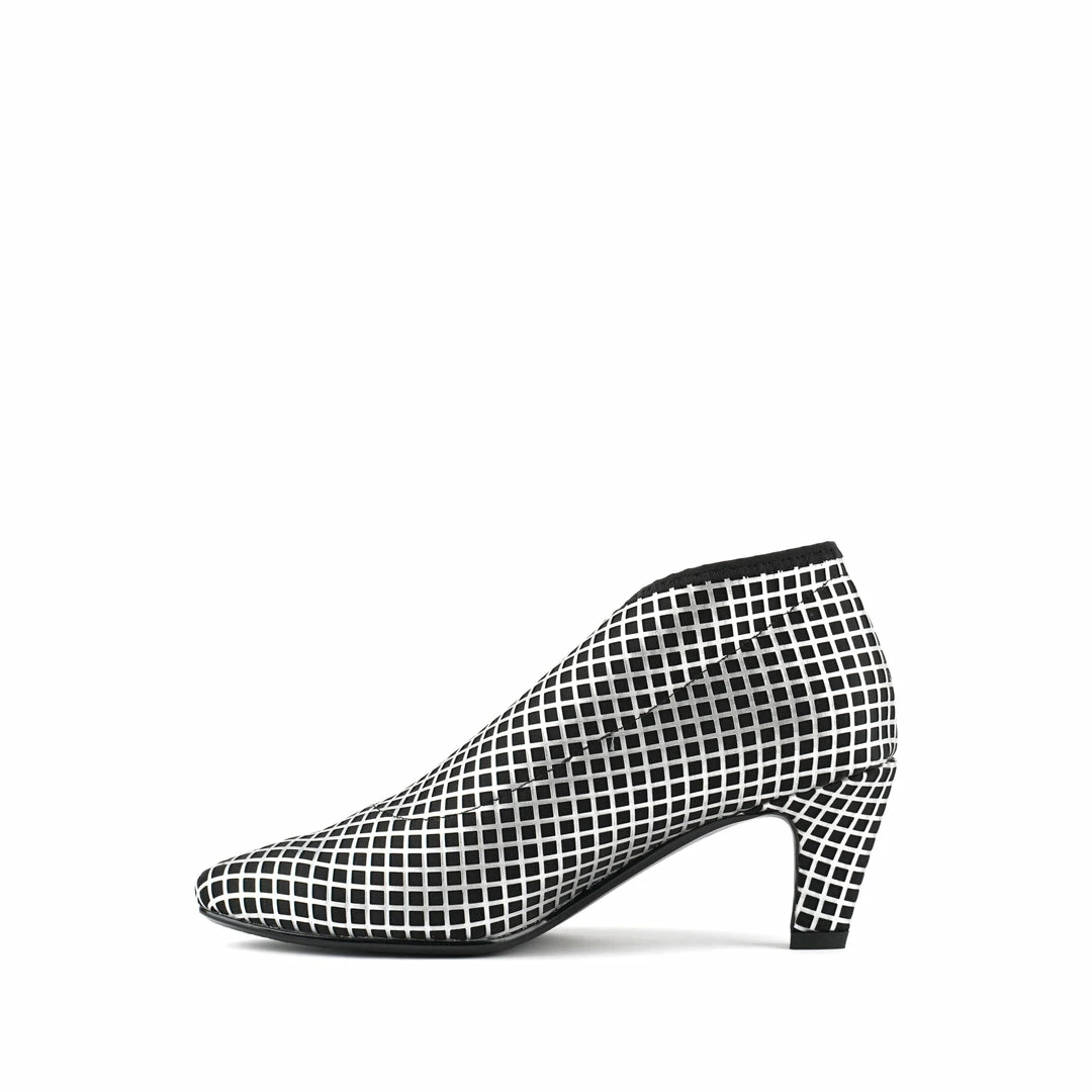 The Fold Lite Mid is a mid-heel ankle bootie with a soft almond toe and asymmetrical top line.
