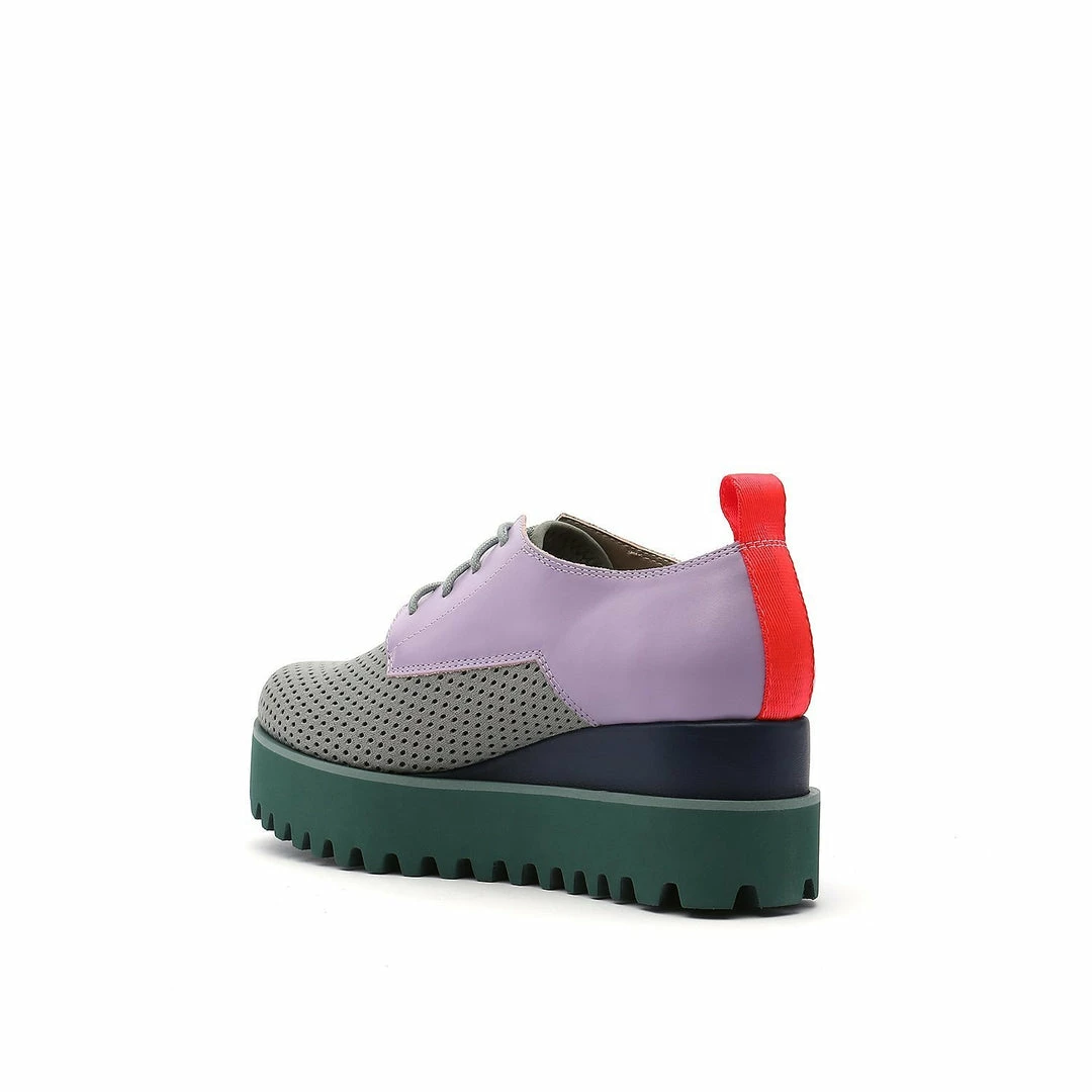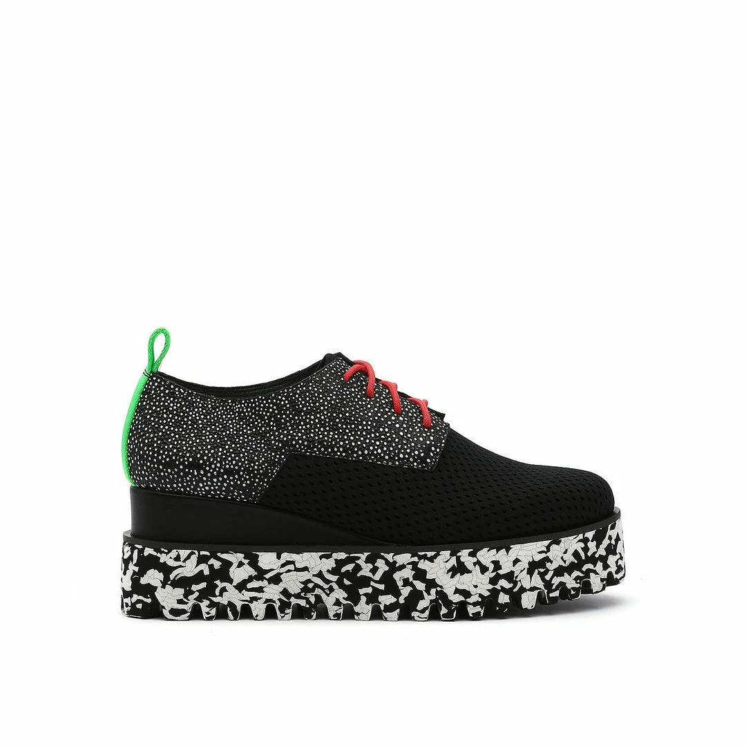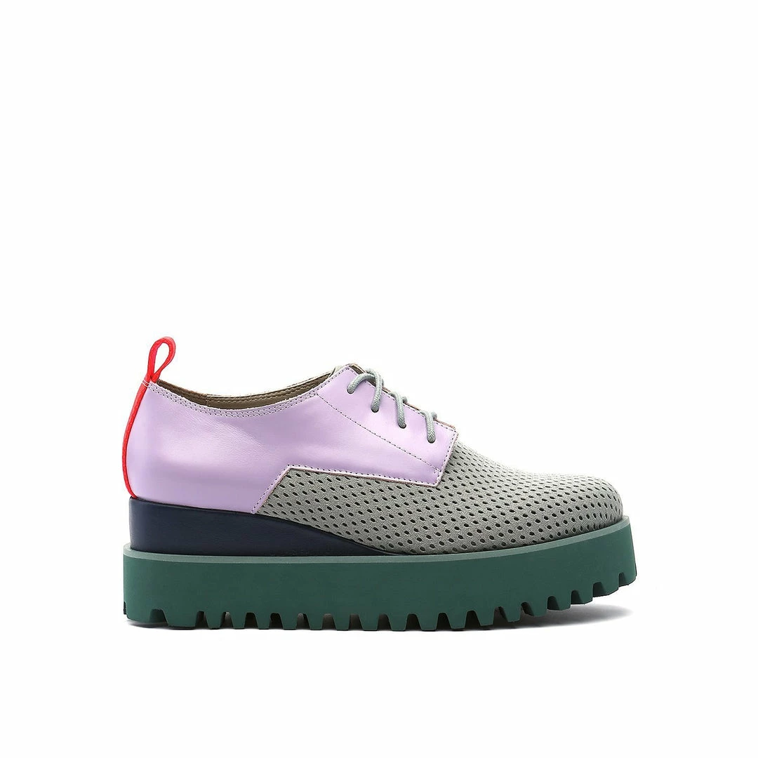 The Juko II is a flatform oxford shoe that is lifted by a low leather wrapped wedge and cleated outsole.
