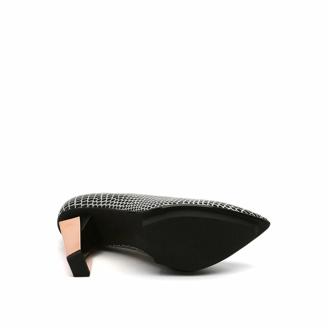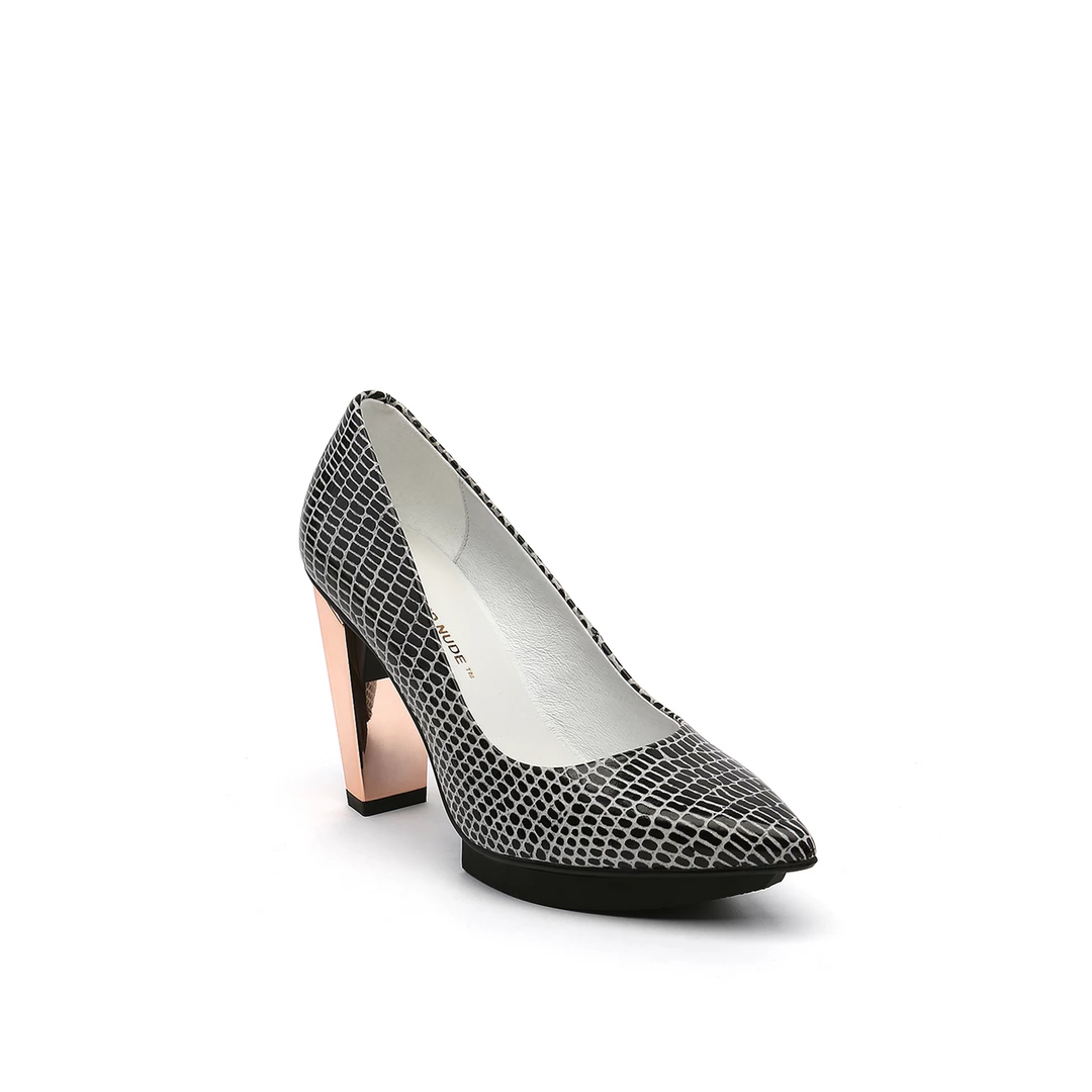 The LEV Pump Hi is a classic platform high heel pump featuring a sleek pointed toe and a striking chrome-plated heel.