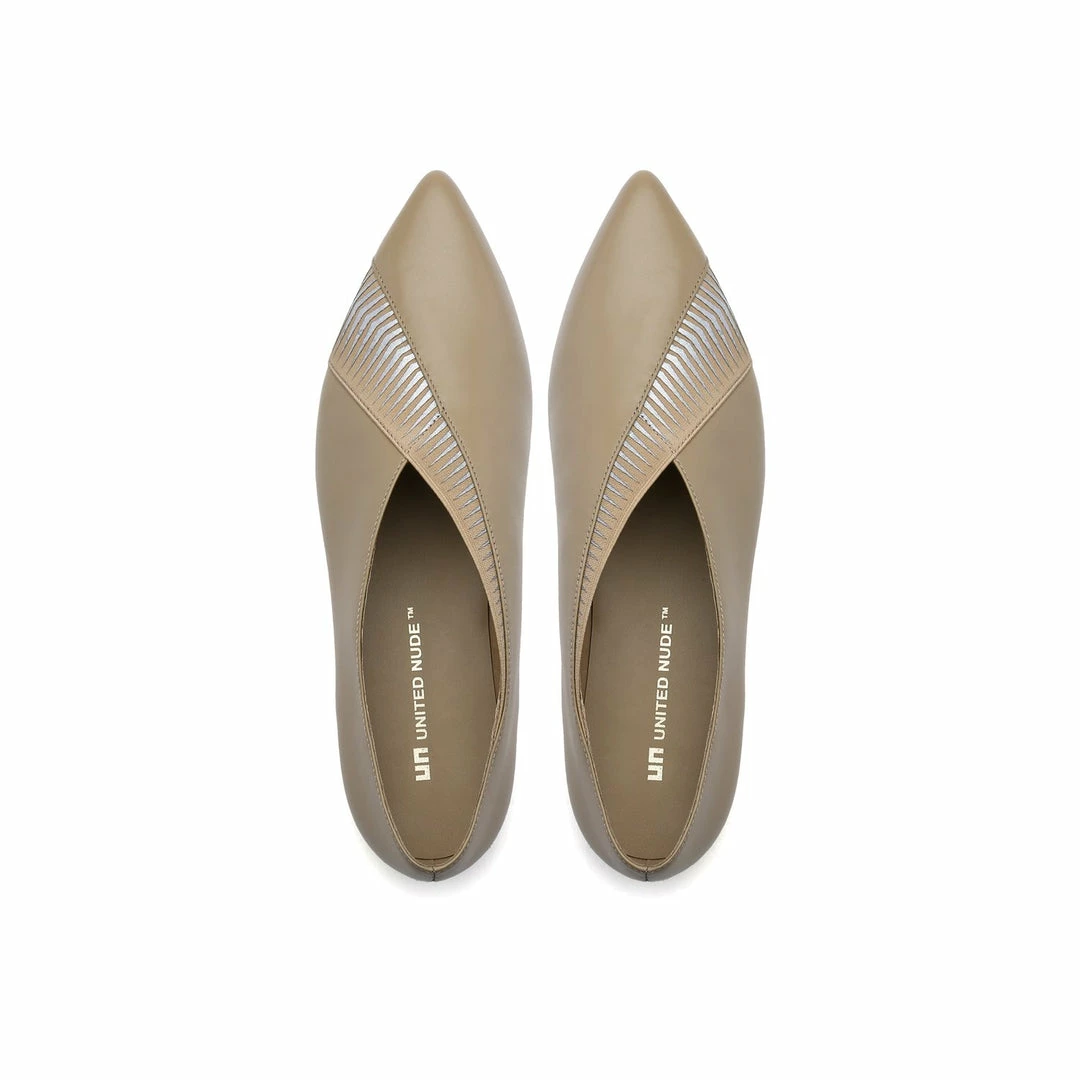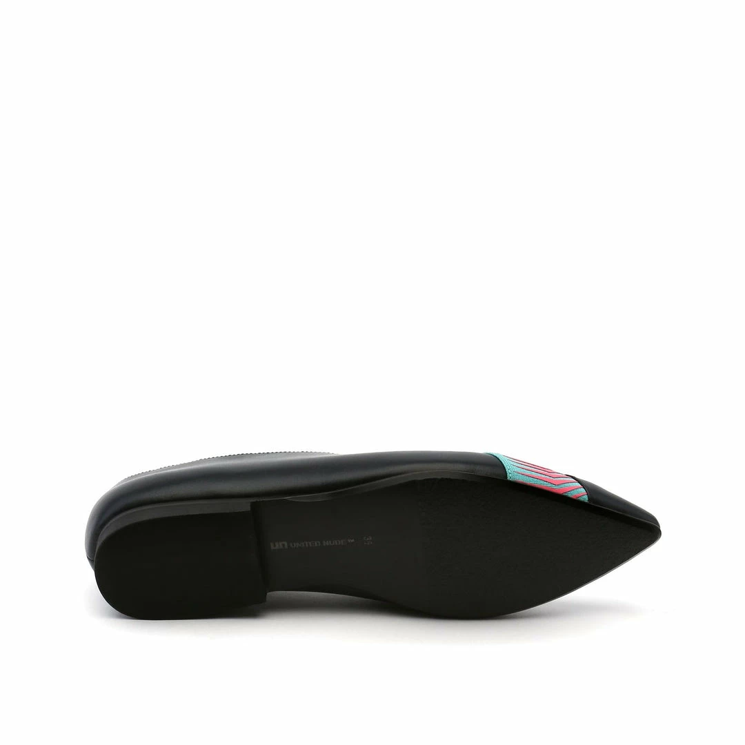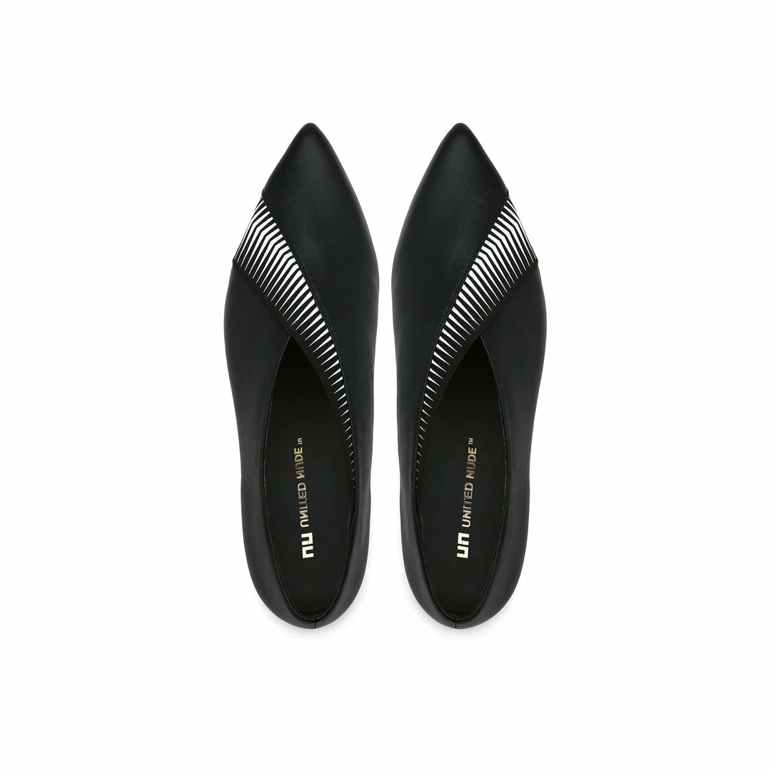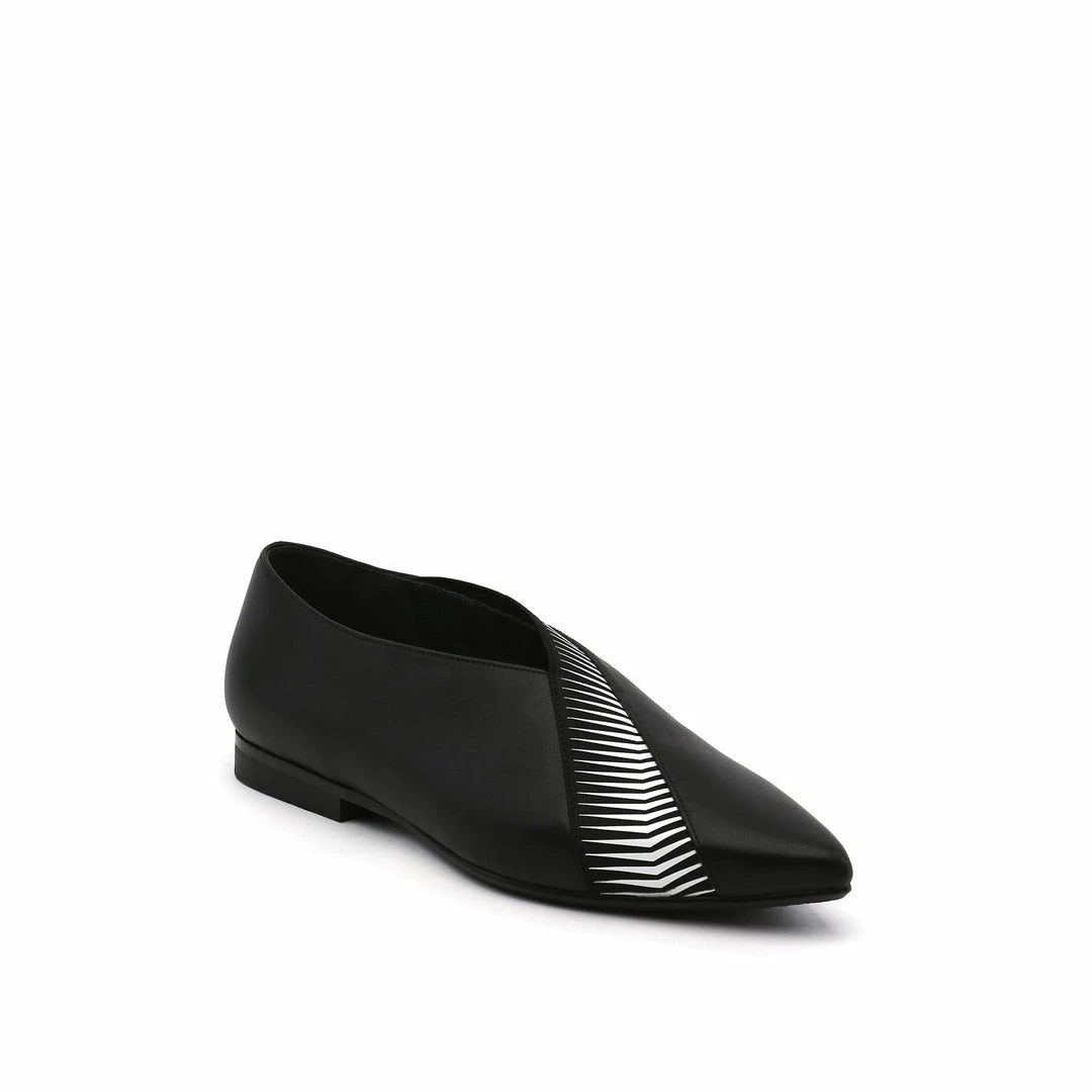 The Peek Pump Lo is a pointy-toe flat with an asymmetrical top line. The elastic accent packs a bold graphic punch.