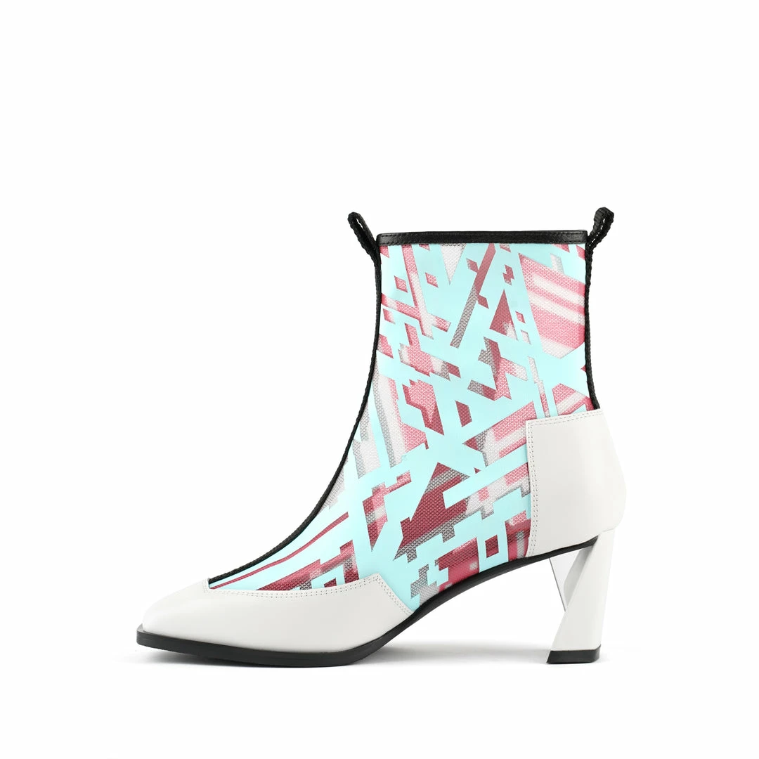 The Rasa Bootie Mid is a mid heel boot with a square toe and a breathable transparent mesh upper framed by leather accents. One side zipper enclosure and two pull tabs offer easy on and off wear. The heat pressed graphics and striking color breaks are inspired by a series of mixed media paintings by United Nude founder and creative director Rem D. Koolhaas.